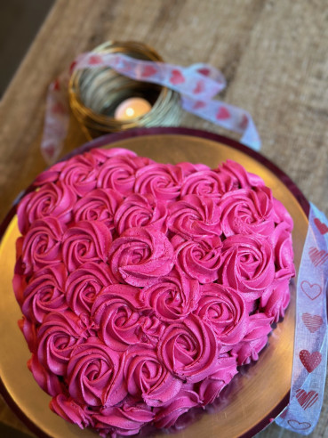 Heart shaped cake (20 cms, for 8 persons) with PINK rosettes (buttercream frosting). Available in Red Velvet or Chocolate flavour. Candles and other accessories available at extra cost.