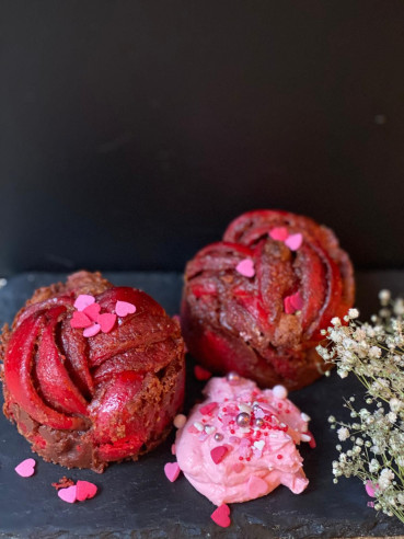 2 Valentine Red Cinnamon Rolls with cream cheese frosting and Valentine sprinkles