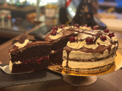 Twee lagen smeuïge chocoladetaart met een heerlijke kersen-roomvulling, afgetopt met chocoladeganache en room.