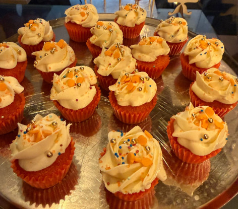 Speciale mini-vanillecupcakes voor Koningsdag, oranje vanille, met botercrème en versieringen (de verpakking bevat 6 stuks).